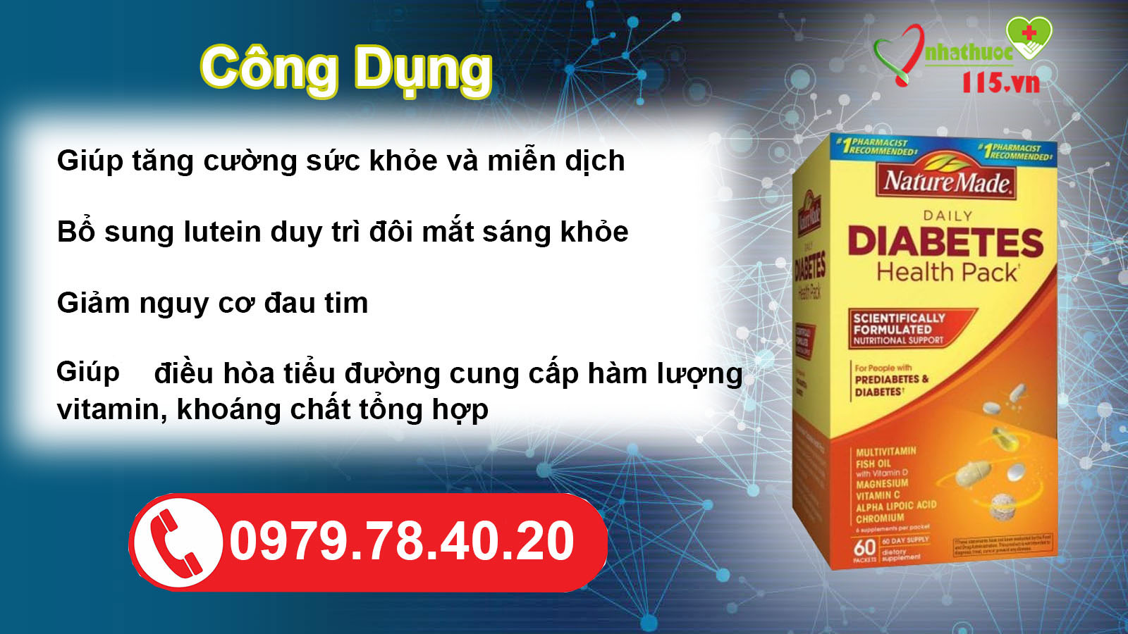 Nature Made Daily Diabetes Health được điều chế dựa trên cơ sở khoa học cung cấp dưỡng chất, vitamin, khoáng thiết yếu cho bệnh nhân tiểu đường. Thành phần của sản phẩm còn giúp điều hòa lượng đường huyết và bảo vệ tim mạch khỏe mạnh.Sản phẩm của Nature Made - nhãn hiệu số 1 được chuyên gia khuyên dùng, hiện đang rất được ưa chuộng trên Thế giới.